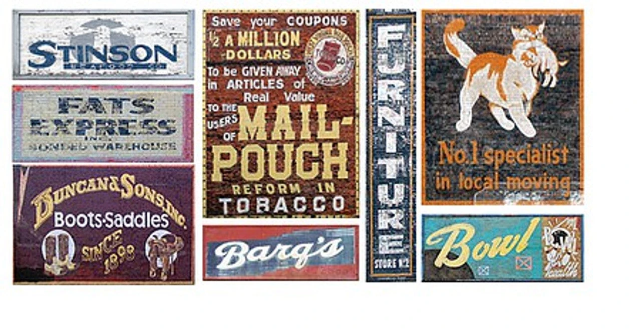 Pre-weathered waterslide decal signs are made using photos of real signs. Easily applied to structures and sign frames. Cut to fit with a decal scissors or hobby knife and apply using the manufacturer’s instructions. Decals are printed on a white decal base and must be trimmed to size.